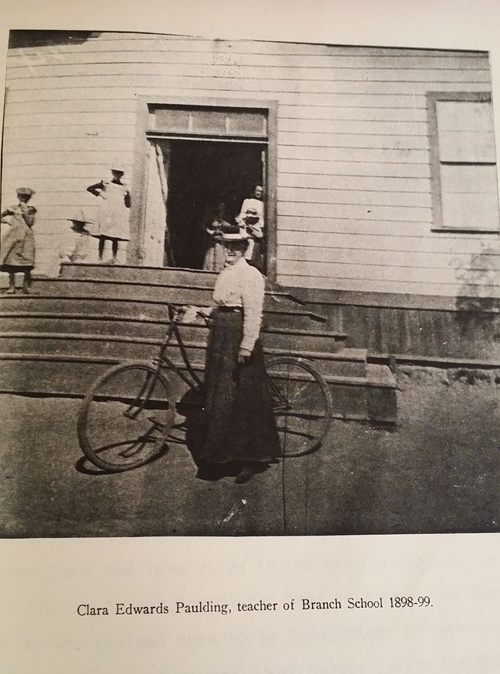 One of Clara’s assignments during more than thirty years in the classroom was at the school I attended, Branch Elementary. There is a photo of her in front of the school. Behind Clara and her bicycle in 1898 are the same steps I would climb on my first day of formal education sixty years later.