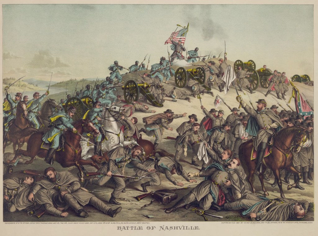 …A month after the Battle of Franklin, outside Nashville, Gen. John Schofield was stalling. Perhaps it was the memory of what he and Otis Smith had seen at Franklin in the tangled mounds of Confederate dead. Now, in December, Schofield was in the same place [Confederate Gen. John B.] Hood had been at Franklin. The Union general was about to lead an assault on an enemy that was well dug in. There was one difference between Schofield’s situation and Hood’s. He was a subordinate officer, not in command. Maj. Gen. George Thomas was Schofield’s superior, and Thomas was ordering him, in the second day of fighting at Nashville, to attack a hillside held by entrenched Confederates. So it would be Hood’s men who would be waiting for Schofield’s this time, not the other way around, and they would be eager to return the favor of Franklin. Earlier that afternoon, December 16, three regiments of U.S. Colored Troops had attacked the Confederate right and were repulsed with forty percent of them dead or wounded—the Confederate officer commanding thetroops that had inflicted this destruction noted the African Americans’ bravery in his official report.