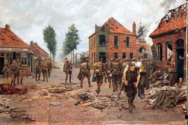 The German soldier survived the war, as did Tandey, but their paths would cross again, twenty years later, oddly enough and quite indirectly, in Munich, a beautiful city. That’s where the German saw this painting and instantly recognized the soldier in the foreground, in what must have been a customary moment of compassion, carrying a wounded comrade.