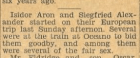 Sadly, the cousins would die far from their American home. A stroke killed Aron in 1909 Los Angeles; a heart attack ended Alexander’s life in 1922 San Francisco. But, as Ditmas notes, they loved to travel, and luckily, they managed to take what was called the Grand Tour together in 1905, four years before Aron’s death. Here’s a note from the Herald-Recorder that clearly indicates the presence of an Aron and Alexander Fan Club: