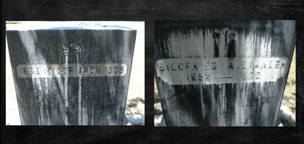 The cousins were eventually buried together. Aron is buried in Plot C8 in the Arroyo Grande District Cemetery; Alexander lies alongside, in C10. Atop their tombstones are the Hebrew letters that tell you