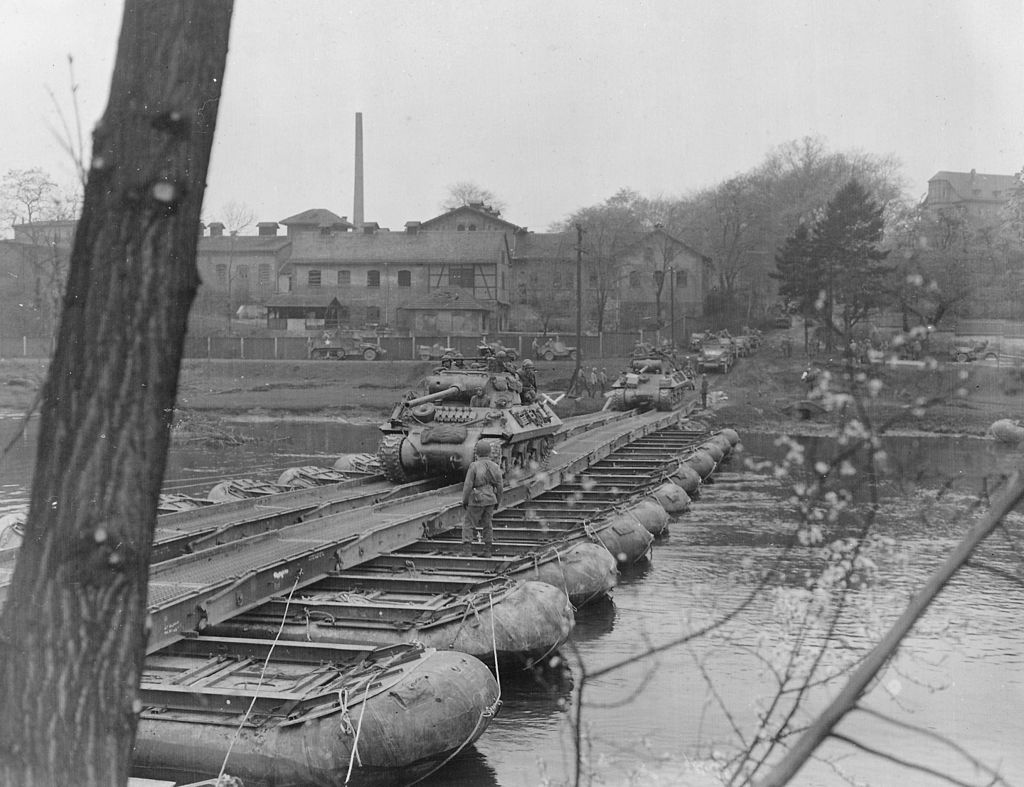 Tank destroyers from Frank Gularte’s unit make the river crossing across a pontoon bridge into Germany, April 1945.