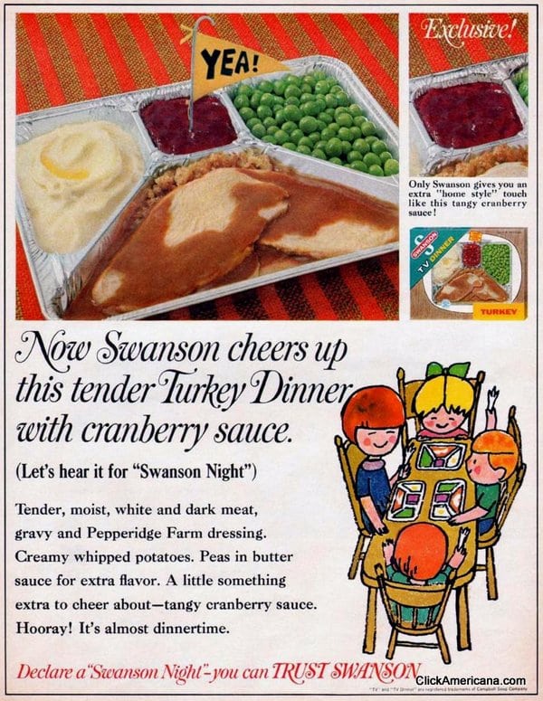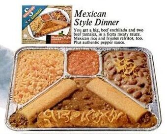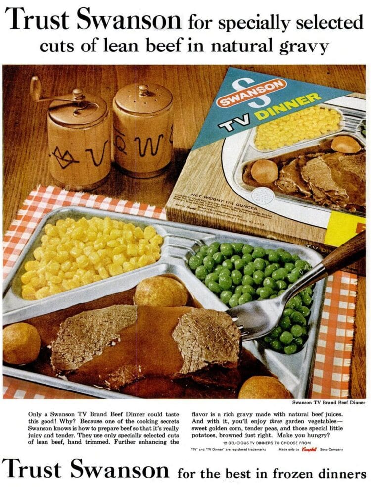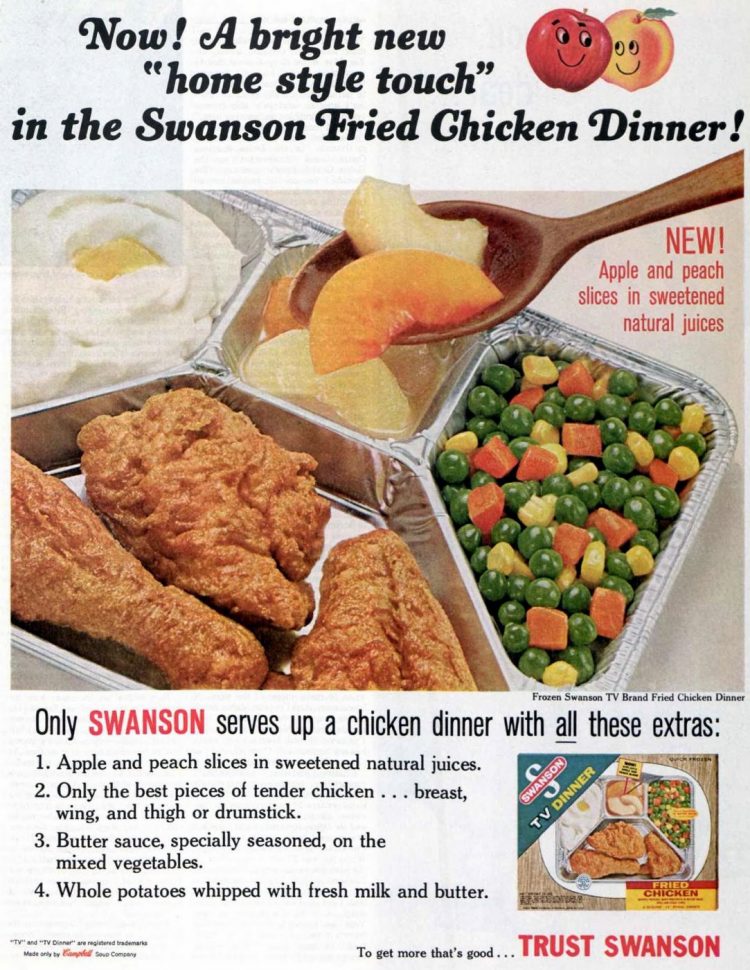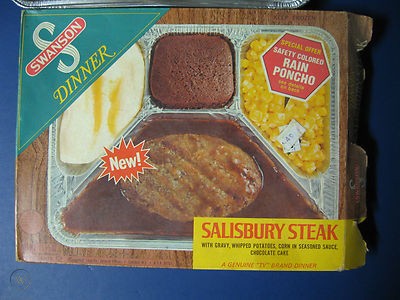 The first TV Dinners began appearing in the mid-1950s, and the Turkey Dinner may have been the first. The turkey had the consistency of papyrus; the mashed potatoes were bland, the dressing turned to goosh, but the peas made outstanding projectiles. We survived the privation younger kids would never know: Cranberry Sauce, added years later, kicked up Swanson’s game a notch. You could dunk the turkey in it to more or less give it some zip.The fried chicken dinners always disappeared from the freezer first. The batter was kidnip (instead of catnip) because it was faintly sweet; the peas this time came with buddies, which made them tolerable, but the mashed potatoes were still disappointing. They tasted like beach sand. The apple/peach combo was a nice notion but they had consistency of banana slugs, whose consistency I do not care to contemplate.I do not understand this cowpoke’s happiness. The one thing you’d think an American TV dinner could do well would be beef. Wrong. This looked like roadsplat and tasted like ketchup, which you could chug anytime out of Mom’s fridge. The fries were an abomination but you ate them first because they were fries. Sort of. The peas were, well, Swanson peas. Boring. Uninspired. Still, they were throwable or, even better, launchable–they traveled at great velocity from your spoon, a kind of dinner-table catapult. Another failed attempt in the World of Beef. The beef tasted like recycled shoe tongues or perhaps the “bully beef” salvaged from the vast British stockpiles left over from the Battle of the Somme (1916). No self-respecting penitentiary would serve a meal this bad. Not even a British one.