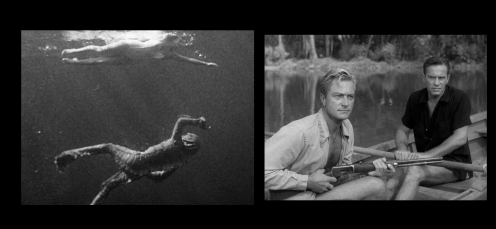 A kind of Female Learned Helplessness theme can be seen throughout Fifties films. Creature from the Black Lagoon’s Julie Adams (1956) gets to swim fetchingly and faint a lot, but only the boys have access to the cool stuff, like the lever-action Winchester and what appears to be a Jumbo Economy Size Spear Gun.