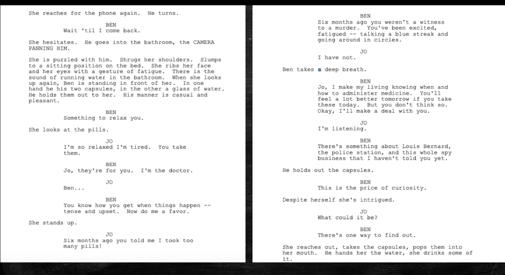 The film scene that brought me up short happens in a Marrakech hotel room, when James Stewart’s Dr. Ben Makenna must disclose to his wife, Doris Day’s Jo, that their young son has been kidnaped. This is how Dr. Ben breaks the news, with the help of Modern Pharmaceuticals:
