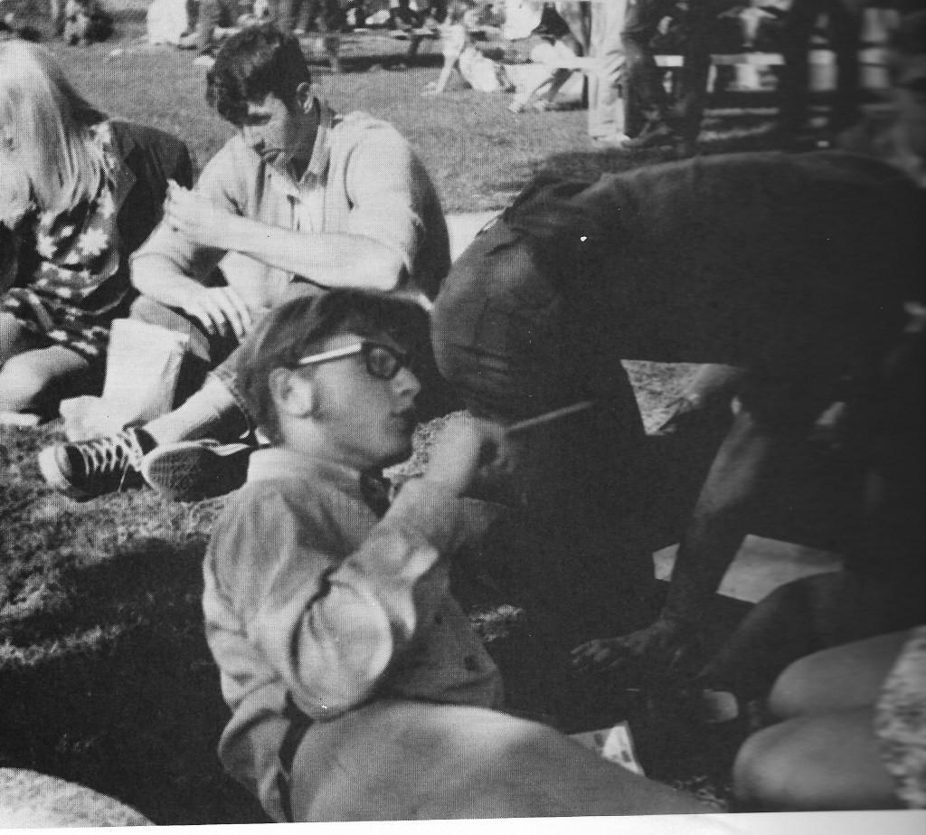 See? I’m being pedantic already. I’m a senior at Arroyo Grande High School, in the Quad, and quite full of myself. Probably I’m at the midpoint of a book–you can see one just beneath my legs—and probably it’s Herman Hesse or Kurt Vonnegut. My victim—you can just see her kneecaps—is my girlfriend, Susan. Susan was—is— extraordinary. She was bright and lovely and, by God, she had tamed a raccoon. She was a horsewoman and she loved my little sister, Sally, so sometimes she’d appear in our driveway and ask to take my seven-year-old sister for a ride. She’d keep one arm around Sally, the other controlled the reins, and they’d ride through Kaz Ikeda’s cabbage fields and talk. My little sister is bright and lovely, too, and I think that a small part of her was formed on those quiet horseback rides.