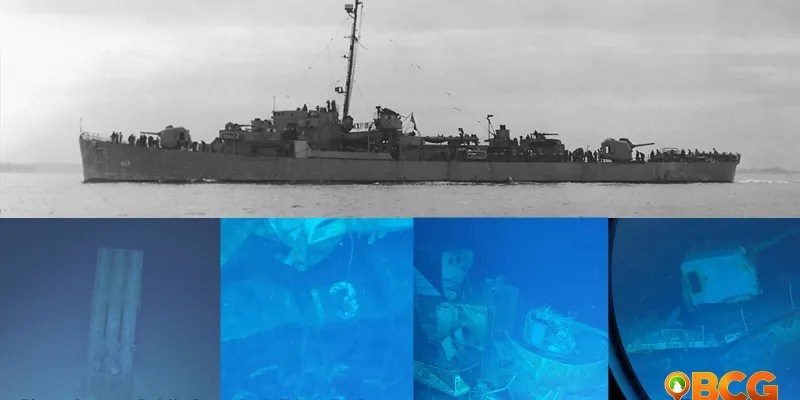 In June 2022, the same expedition discovered Johnston’s comrade, USS Samuel B. Roberts (below), at 22,000 feet. In the same battle, Roberts, 1370 tons, took on the heavy cruiser Chokai, blowing off her stern with a torpedo hit; the ship later had to be scuttled. Roberts’s commander, Lt. Cdr. Robert Copeland, then turned his attention to the heavy cruiser Chikuma, setting that ship’s bridge afire and destroying her No. 3 guns before three fourteen-inch shells from the battleship Kongo sent Roberts to the bottom. Ninety of her 210-man complement died, among them Gunner’s Mate 3c Paul Carr. His aft 5-inch gun turret is at far right in the photo sequence below. Carr died only after firing 325 shells at the enemy in a little over 35 minutes. A guided missile frigate is named for him today.