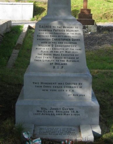 Maybe it’s typical that this memorial was made possible by expatriates, Irish living comfortably and happily distant in New York. What it commemorates might be too painful to remember for the people who live in Ennis today. The four Irish Republican Army men cited on this monument were killed in The Troubles, but not by the English. Three of the four were shot by firing squads made up of fellow Irishmen during the Civil War of 1922. Two were eighteen years old. They were Republicans executed by soldiers of the Irish Free State, the government that shot three times as many Irish revolutionaries in 1922 as the English had during the rising of 1919-1921.