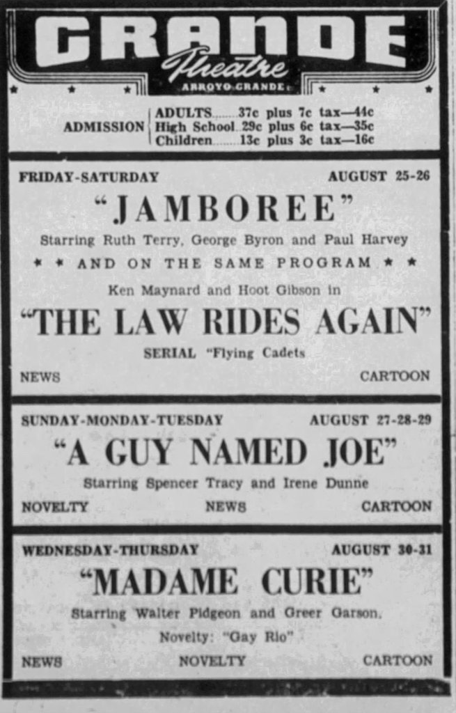 The Grande was ideal, too, for high school dates, because just down the street, in today’s Village Grill, was the Economy Drug Company, which featured Arroyo Grande’s soda fountain. Soda fountains were vital to Mickey Rooney and Judy Garland and seemingly, to most young couples in the 1930s and 1940s. My mother was a soda jerk in Taft in 1939 when Dad came in for an ice cream sundae. They were married in 1940.