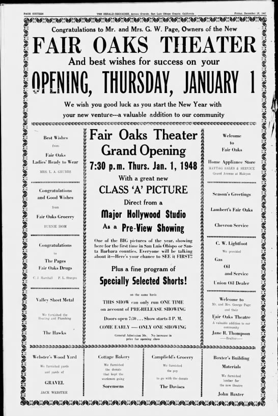 The theater opened in 1948 and by 1955, when my family moved from Taft to Arroyo Grande—the brick barbecue my father built still stands in the back yard of our old Sunset Drive home—it was kind of the center of a community that was growing rapidly.