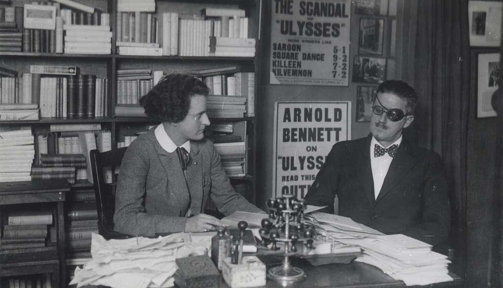 Sylvia Beach and James Joyce inside Shakespeare and Company