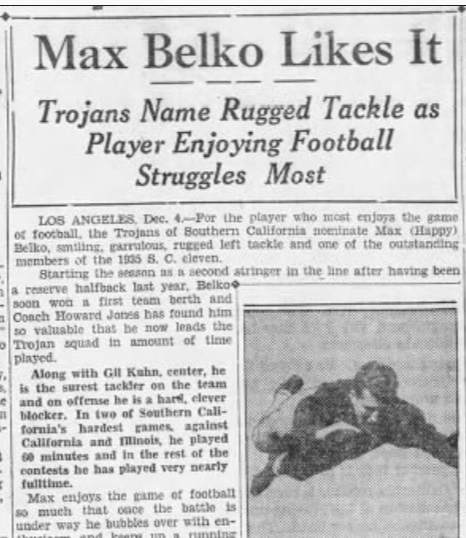 And by the 1930s, the new gym had a new coach. USC Trojan football star also coached basketball in that gym, and he brought a formidable reputation with him. Somehow, Belko, from a tough immigrant family, steelworkers, in Gary Indiana, had somehow escaped the attention of Notre Dame. USC was fine with that. His coach there, Howard Jones, called him “the finest example of a man I’ve ever coached,” and Belko, among other things, kicked a field goal against Montana in 1935. Inexplicably, USC wouldn’t kick another field goal for fifteen years. Frank Gifford kicked that one.