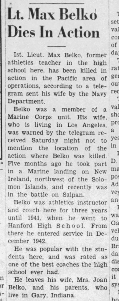 By then, Belko had left Arroyo Grande for a teaching position in Hanford. But the war would sweep him up, as well. The clipping below is from the August 14, 1944 edition of the Arroyo Grande Herald-Recorder.