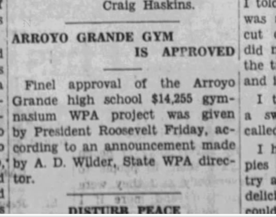 For one thing, Arroyo Grande sports fans had been wanting a high school gym—this would’ve been for the 1916 high school, atop Crown Hill—for many years. For another, it’s a legacy of American history, a small part (for a town of about 1,000 people in 1937, a big part) of American history. Along with the retaining wall below Paulding, the WPA stamps on Mason Street sidewalks and the stone fence around the town cemetery, it’s one of the last legacies of the New Deal.