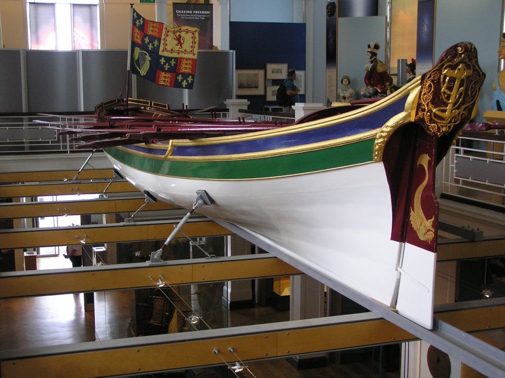 The Royal Naval Museum even has Nelson’s funeral barge on display–it processed up the Thames to St. Paul’s–and one of my favorite Horatio Hornblower moments, in Hornblower and the Atropos, has him, as a young officer, commanding the barge crew. It springs a leak and the crew has to bail desperately to prevent Nelson’s coffin from sinking into the Thames and so into the deep mud of the riverbed.