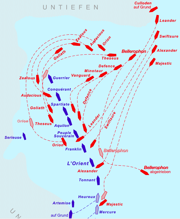 And, earlier, at the Battle of the Nile, the combined French/Spanish fleet anchored their battle line in shoal water, close to the Egyptian shore. No ship, they thought, could outflank them to engage their larboard guns. That’s exactly what Nelson did, risking grounding his ships and having them blown to splinters as a result. The British lost no ships that day; they sank four enemy ships and captured nine more.