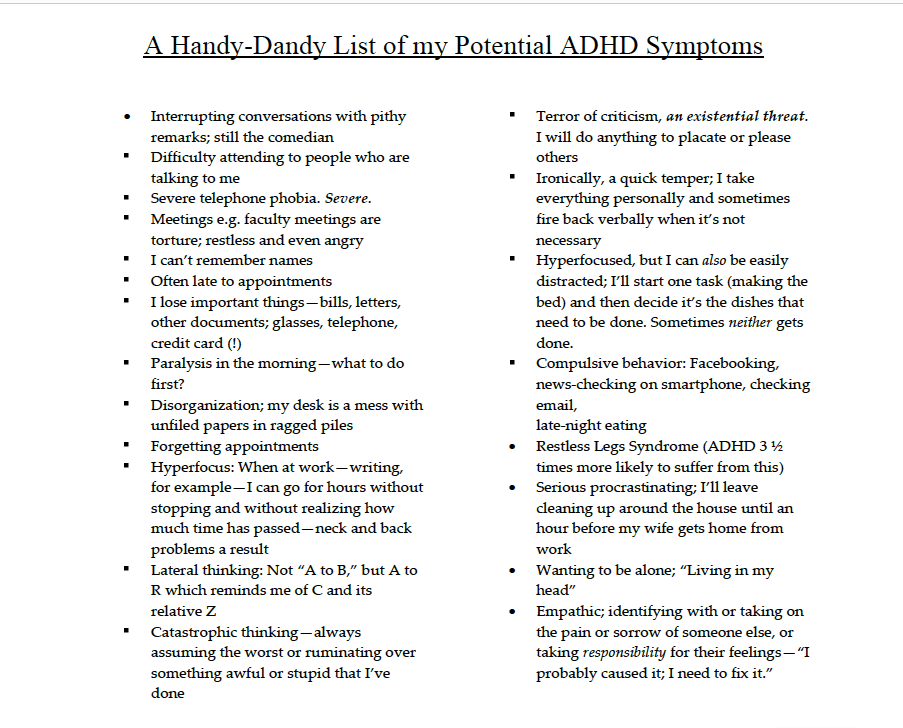 I have pretty much decided that I have ADHD—my psychology doctorate is speeding its way here from Trump University– so I offer this as a public service for other folks who might be, too. It’s a condition that can get you into all sorts of trouble. It’s sometimes great fun.