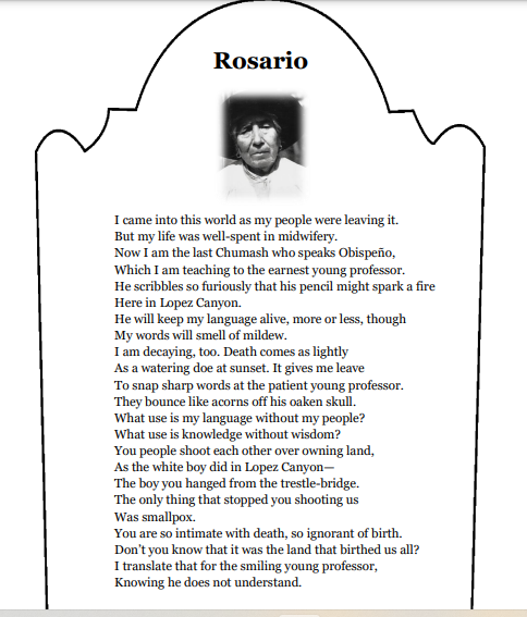 Note: The origin for this was a class I taught teens as part of the Central Coast Writers’ Conference. This was a model. The teens then chose a person from local history and wrote a “tombstone poem” for that person.