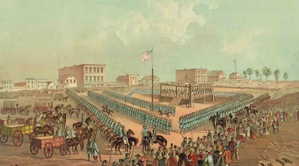 The hangings happened the day after Christmas, 1862. The Sioux sang as they climbed the scaffold and stood on the plank that would be collapsed on the signal of a settler whose family had been murdered. Their hands were bound, but the condemned men tried desperately to touch each other in that final moment.