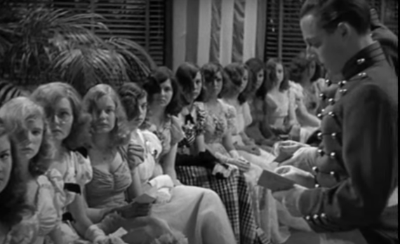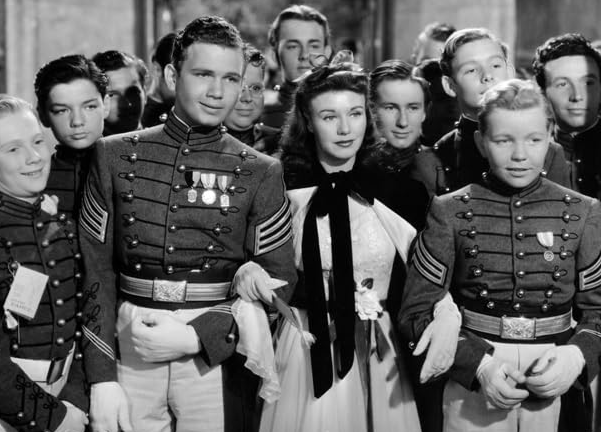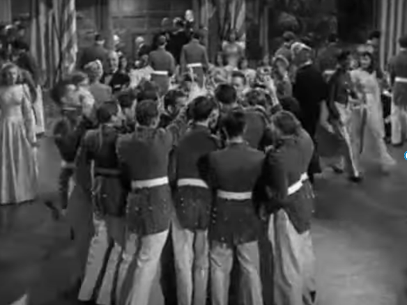 Of course, Rogers falls in love with Milland. All four companies of cadets at the military school where Milland teaches fall in love with Rogers. Here she is waving to the lads on parade below.