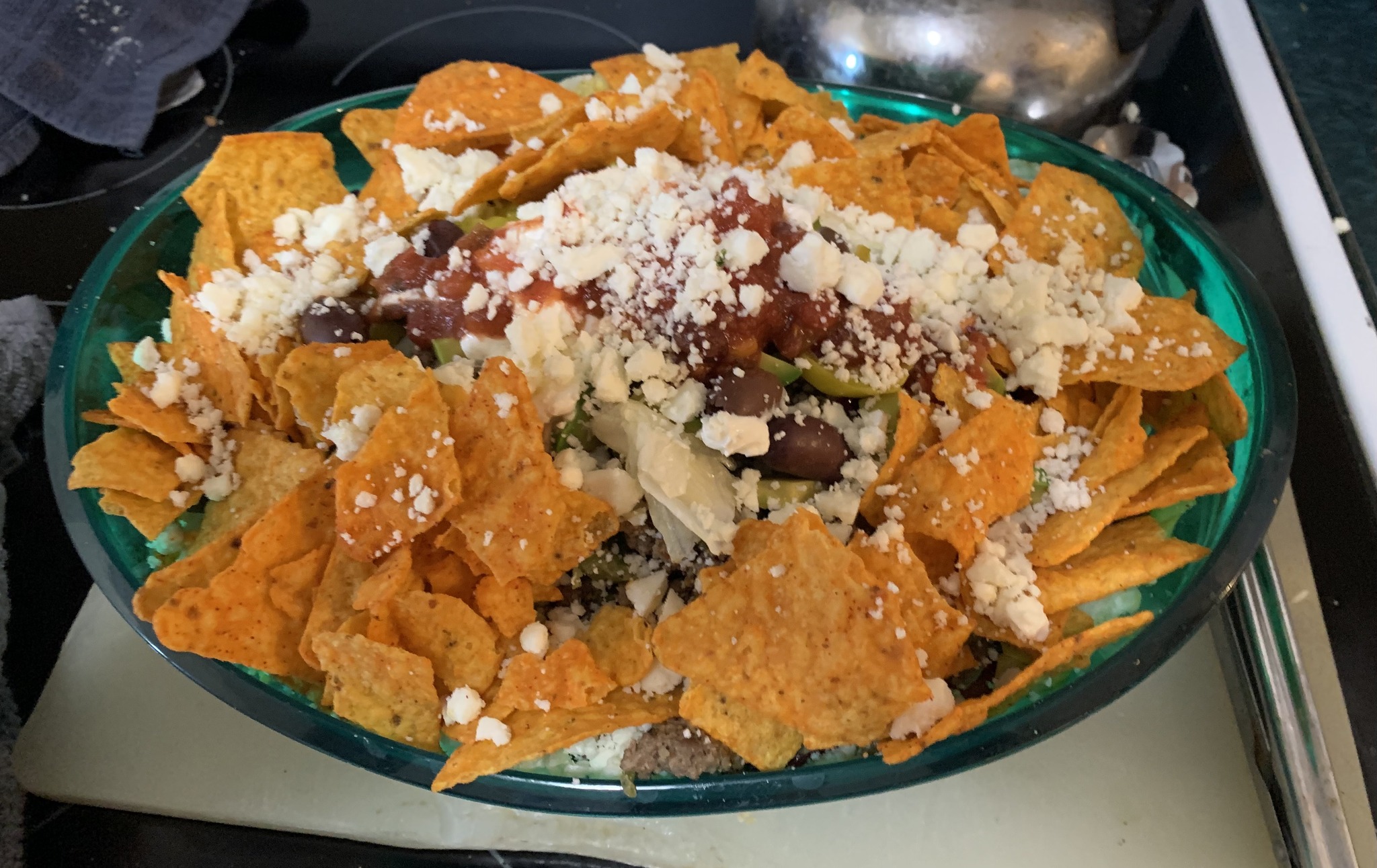 In the center of your vegetable conglomeration, after a short speech of welcome, place atop them the hamburger meat, ringed by queso, bombarded by banana peppers and Greek olives. I like to pretend I’m a crop-dusting biplane during this step.