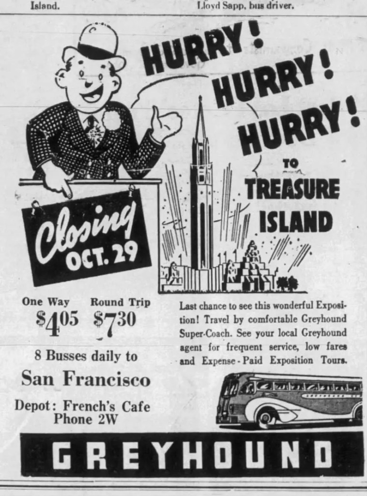 The Exposition even won periodic mention in the little Arroyo Grande Herald-Recorder, including this October 1939 display ad. I think the Greyhound station was in the Olohan Building, whose basement is now home to Klondike Pizza. A Klondike pizza is also good for transient moments of optimism, if I may be allowed to editorialize.