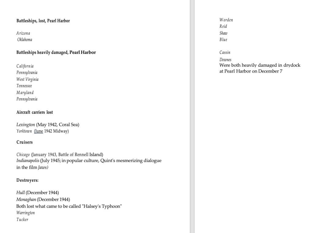 As devastating as the photograph above is, both destroyers were salvaged, rebuilt and returned to duty, as were the damaged battleships. One of them, Nevada, which made a heroic run under attack for the Pearl Harbor exit channel, was, on June 6, 1944, hurling 14-inch shells at the Germans defending the Normandy invasion beaches. Nevada, in fact, was granted the honor of firing the opening salvo that day.