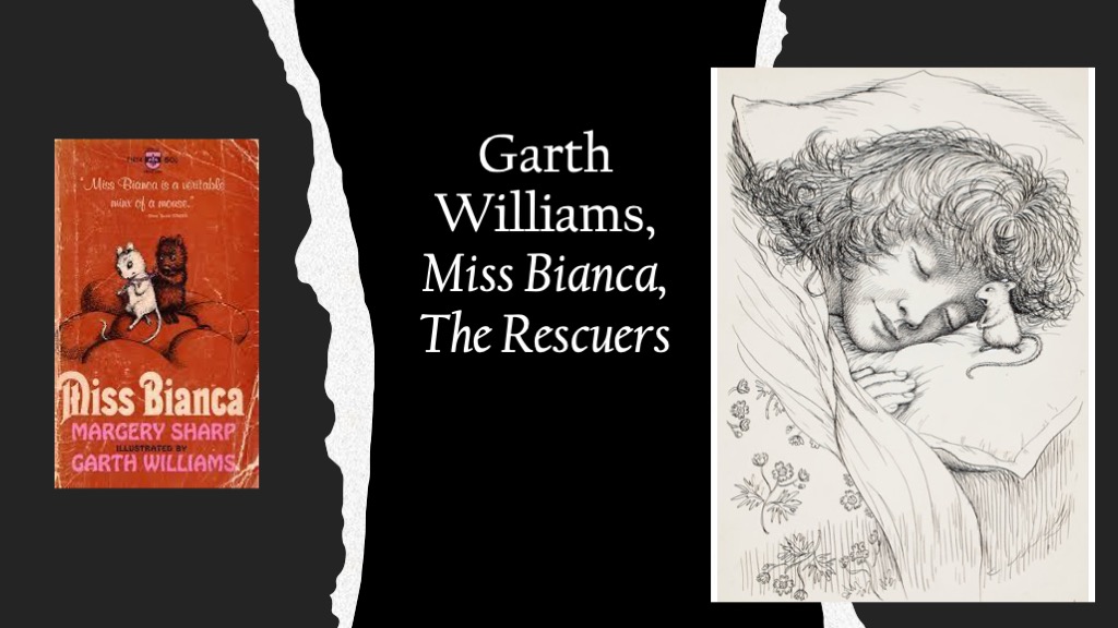 I’d forgotten how bluntly charming Garth Williams’s Miss Bianca illustrations were. Sadly, Disney made a cartoon version with Disney art at its low point–The Rescuers were two-dimensional cutouts and Bianca’s voice was provided by Eva Gabor, who was charming in “Green Acres,” a low point for American comedic television but several notches above “Gilligan’s Island.”