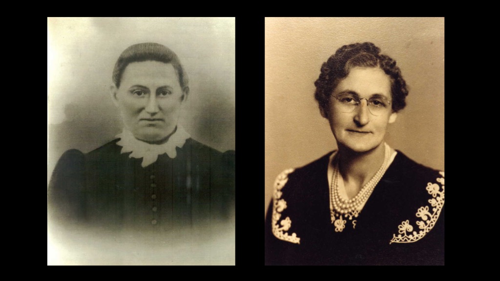 This is Aunt Aggie, on the right, later in life. That’s her mother, the scary lady, my step-grandmother, Dorriska Rose Trail. (She died and my grandfather John, widower, married my grandmother, Dora, widow.) The noses give their connection away—DNA does not lie much—but Aggie’s a softer person and she loves her pearls. Me, too.
