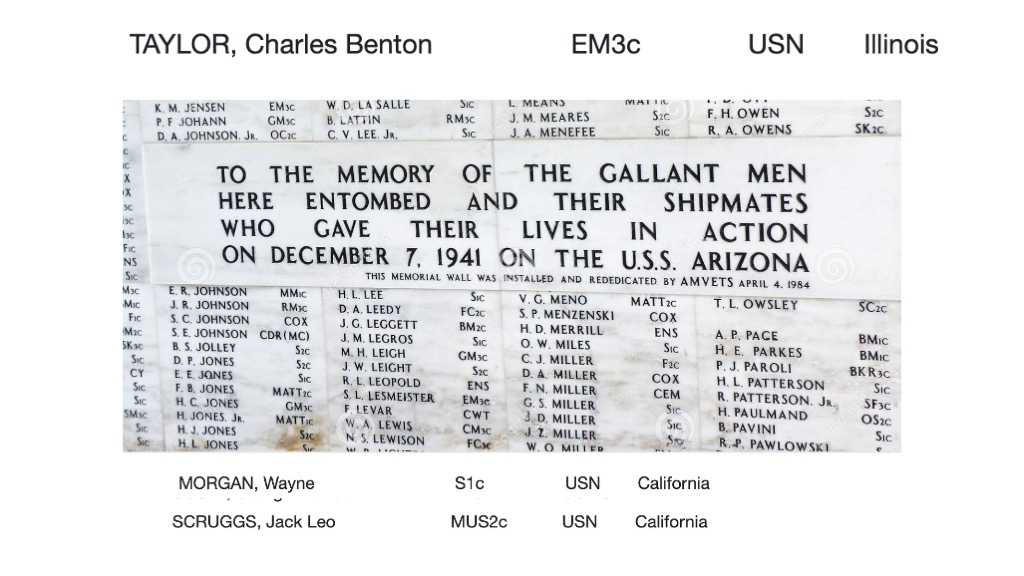 I didn’t remember the whole story, but Dad used to talk about a cousin who was killed on Arizona. It was Wendy Taylor’s comment that set me to thinking. I had no idea that a morning spent researching my aunt, Aggie Caroline Gregory Taylor, would take me back, once again, to Pearl Harbor and December 7, back to a war that took my Dad, an Army lieutenant, from Raymondville and Taft, California, to London and Paris.