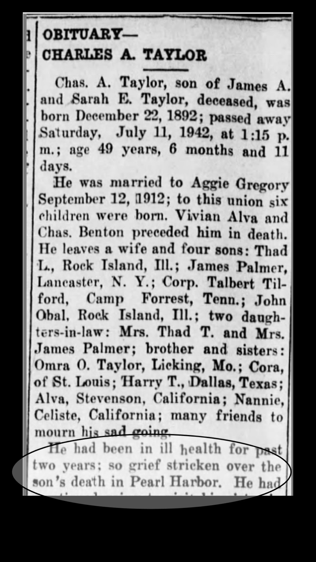 Charles and Aggie were living in Illinois when, sadly, he passed away at 49. Aggie would live another 38 years. I found his obituary in a Houston, Missouri, Herald from July 1942, and it contained this poignant detail: