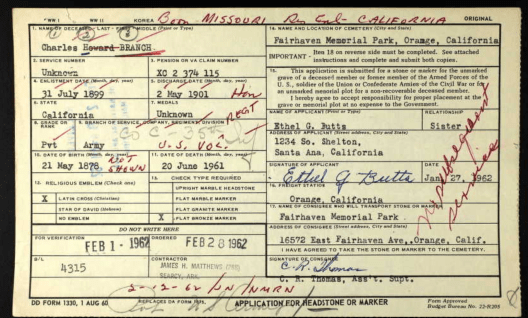 But the tear-gas gun also represented a kind of deja vu in Charles Branch’s life. He was a staunch member of and officer in the local Spanish-American War veterans’ organization, but that’s a slight fib. It’s more likely that most of these veterans fought instead in the Philippine Insurrection (1899-1902), one of America’s most controversial wars. His sister’s application for a military tombstone—Branch died in 1961 and is buried in Santa Ana, in Orange County—gives the game away.