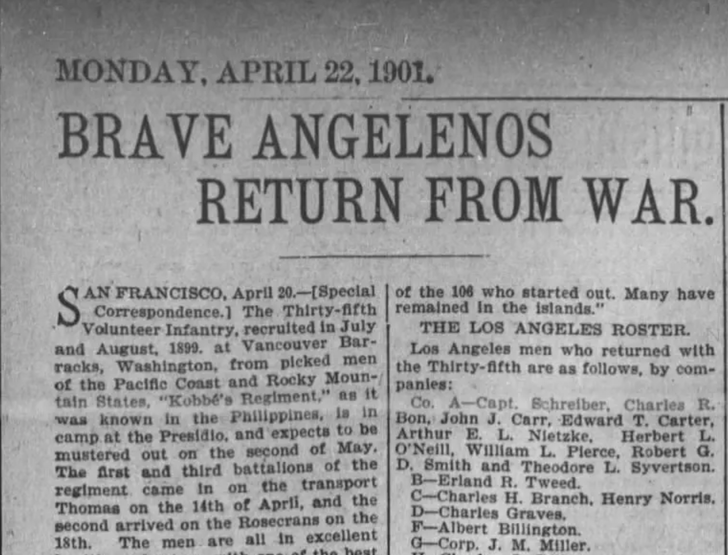But they had a Californian, Charles Branch, as one of those rankers. He avoided dying on the troopship that left San Francisco for Manila. Ptomaine poisoning swept the 35th—turn-of-the-century soldiers were issued tinned meat that was Civil War surplus—and at least one soldier, from San Francisco, died en route to the Philippines.