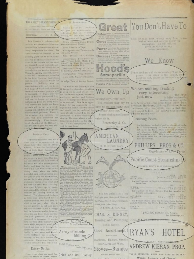 A kind of glossary to a page from the October 3, 1896 Arroyo Grande Herald, the town’s weekly.