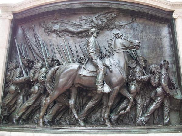 The 54th leaves Boston in this scene from the film Glory, which remains, in my mind, the finest Civil War film yet made. Frederick Douglass watches from the reviewing stand and, as fine as the soldiers are, it’s the reaction of the Black Americans in the crowd, and Col. Shaw’s reaction at seeing his family, that move me most:
