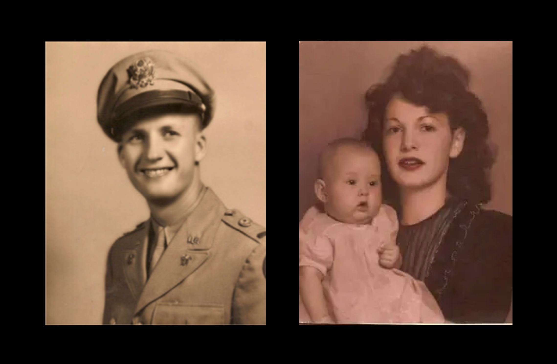 Here are Lt. Dad, 1944 and Mom with my big sister, Roberta, 1943.
