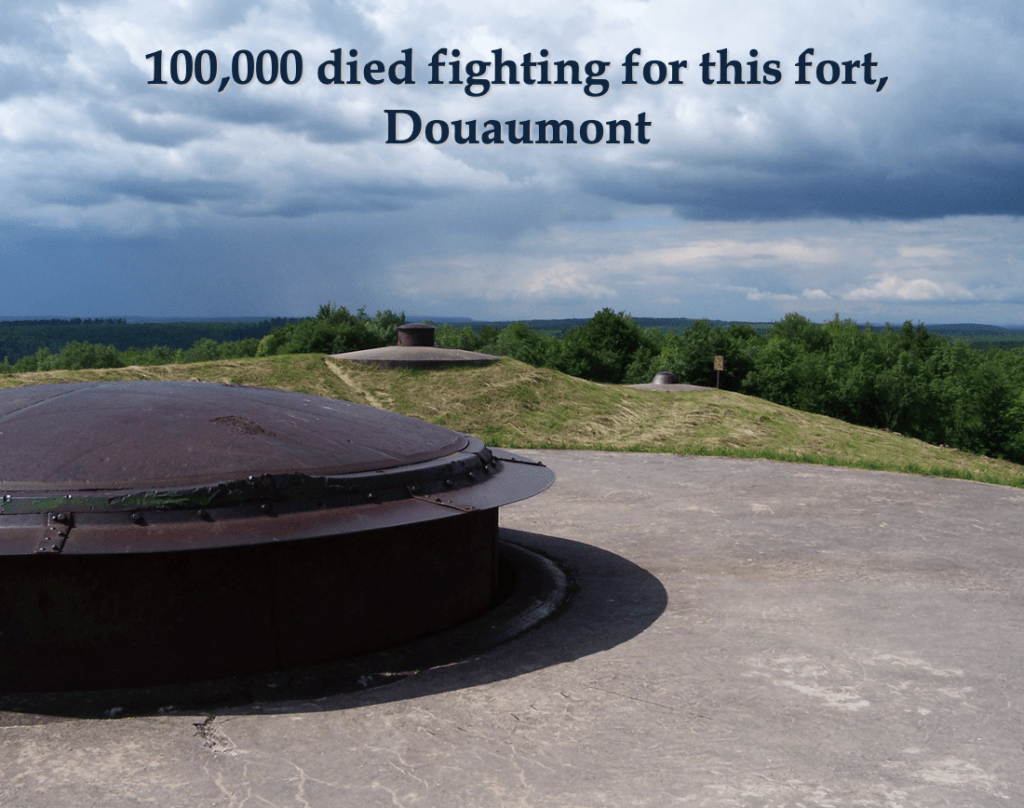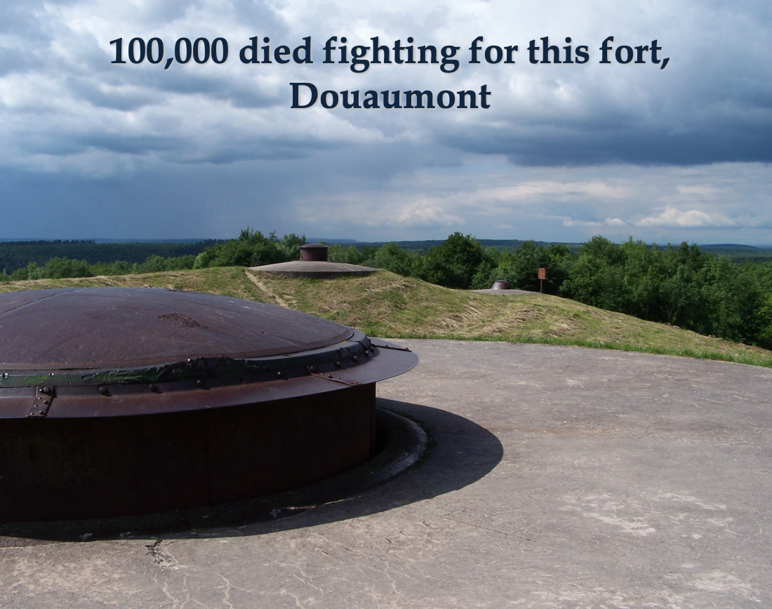 “100,000 died” struggling for Fort Douaumont; those are our kids. When it was the Germans’ turn to occupy the fort, the Bavarians, because they are civilized, decided to brew coffee inside. There was no fuel to start a fire to brew the coffee. One of the Bavarians, suddenly inspired, emptied out a hand grenade’s charge and make a little mountain of the contents to start the fire.