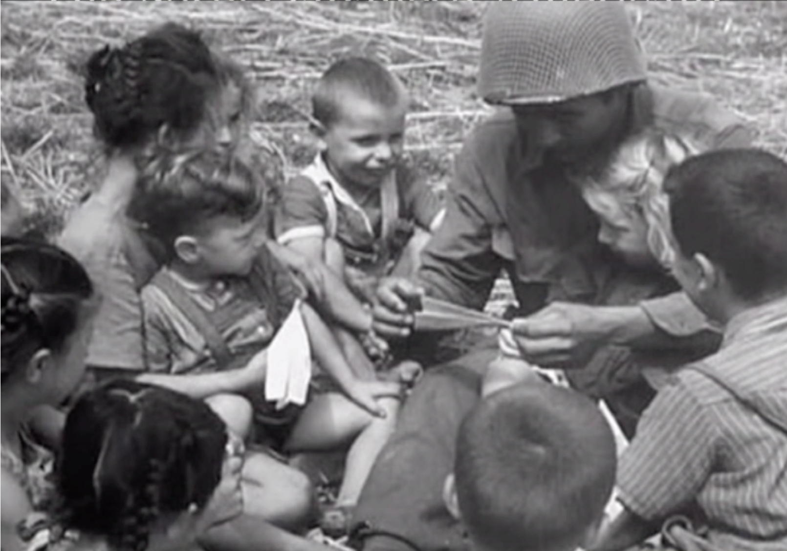 A Nisei G.I. with the 442nd Regimental Combat Team teaches a rapt audience how to make a paper airplane. His arm’s around a little girl who’s nestled close to him. I suspect that in this moment she feels safe, probably for the first time in a long time.