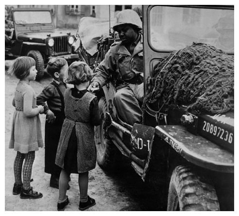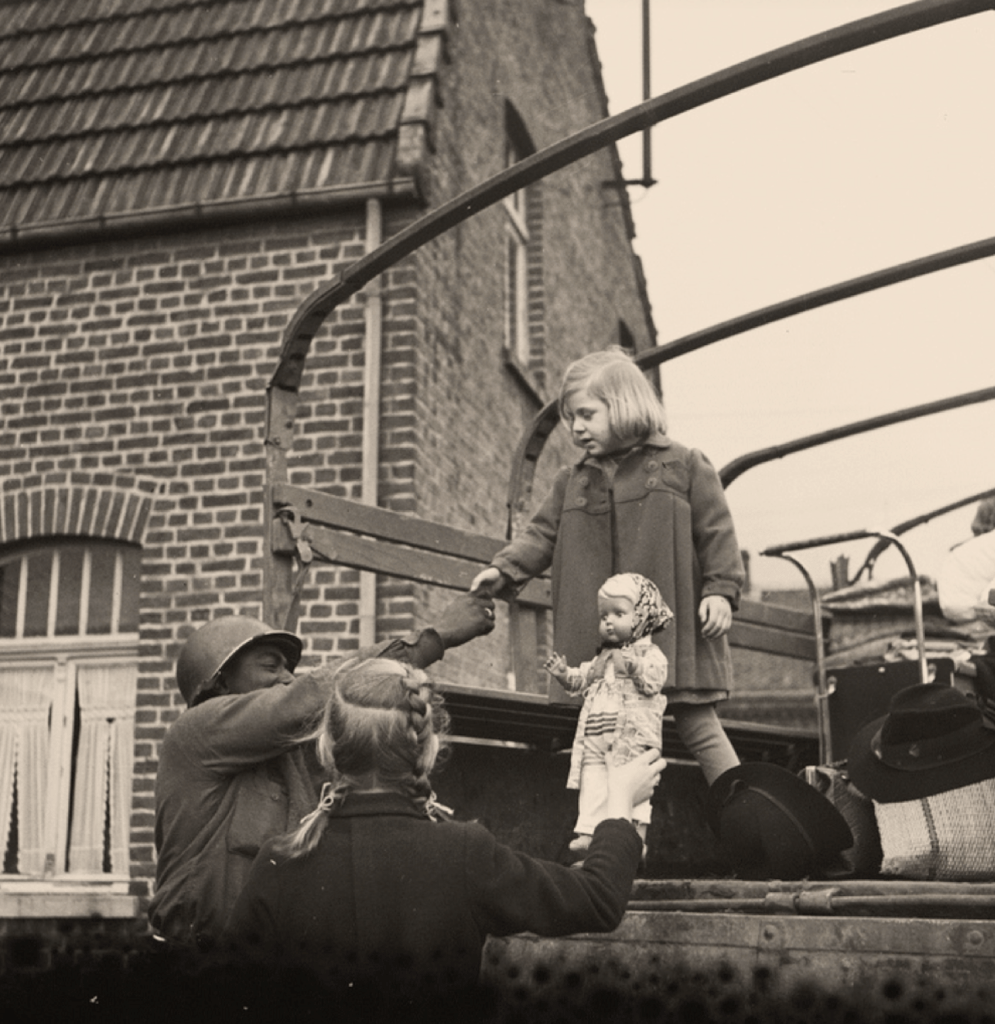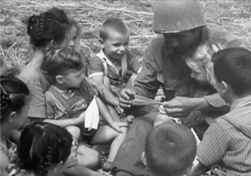 Finally, a soldier, I suspect a member of the famed Red Ball Express, makes friends with a little refugee while another little girl–her sister?–makes sure that she doesn’t leave her doll behind.