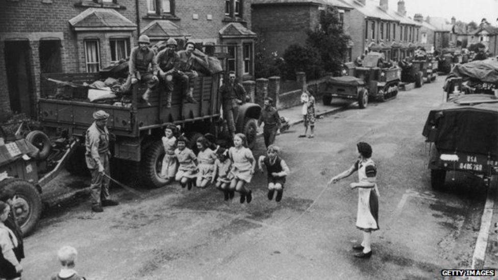 In England, shortly before D-Day, a G.I. gives a British lady help with the jump rope.