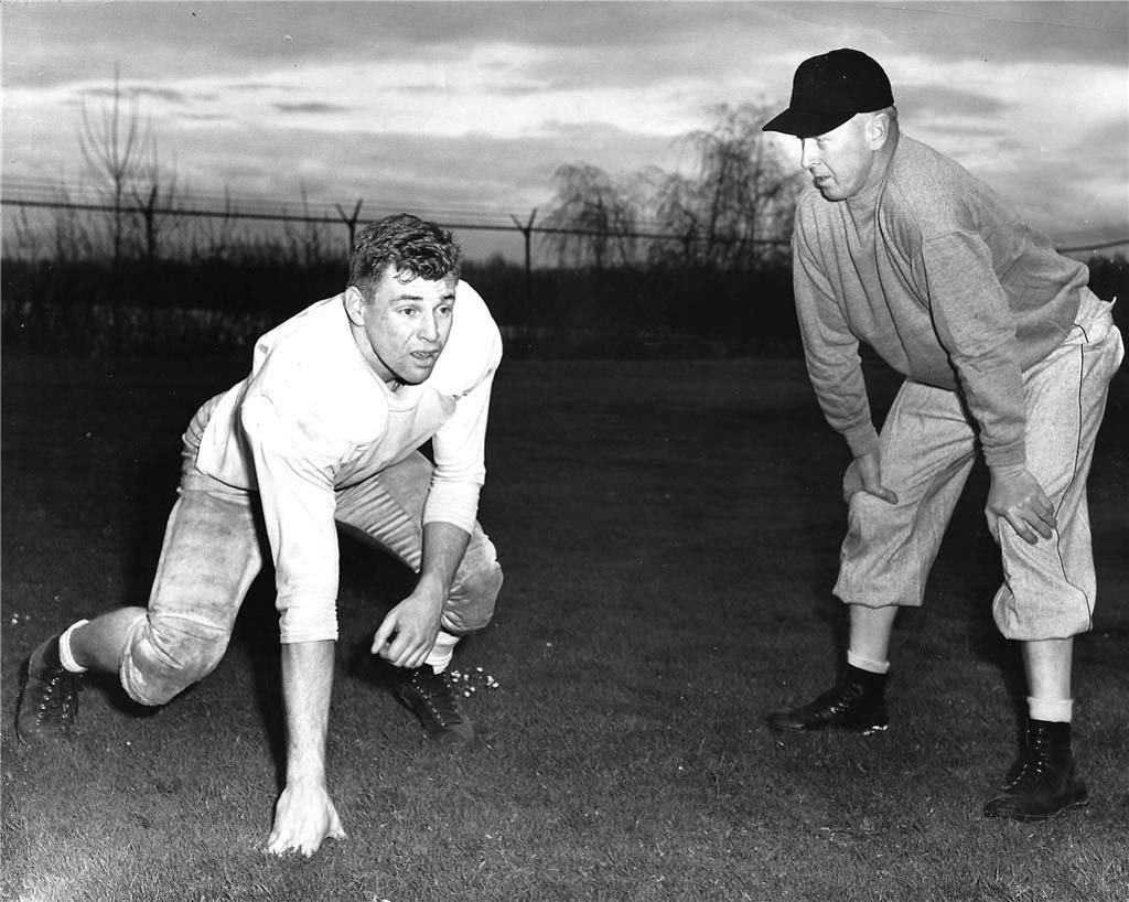 My father-in-law Gail was a University of Washington Husky Puppy–that’s him in the photo with Coach Howard Udell in the late 1940s…