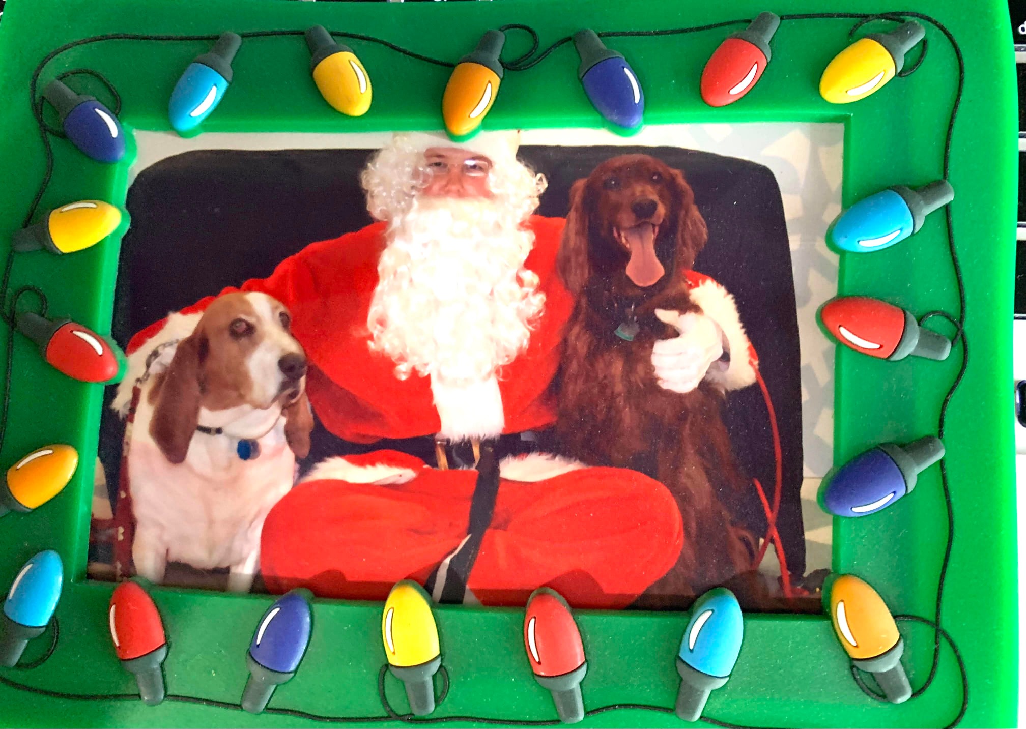 Many years later, the closest approximation of that Santa, in spirit, came at a local pet store (In Santa Maria. Sigh.) when our late and dearly beloved dogs, Wilson the Basset and Mollie the Irish Setter, got to visit this Santa. In reality, “Santa” was a former student of Elizabeth’s at St. Joseph High School, and this may be my favorite Santa photo of all time.