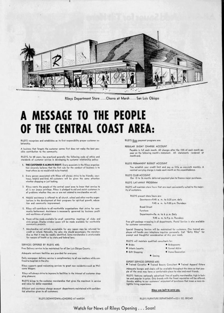 The ad’s a little misleading. This wasn’t the grand opening of Riley’s—just this incarnation of Riley’s. That department store, under one name or another, had been a San Luis Obispo fixture since the 1880s. It got its final name in 1914: