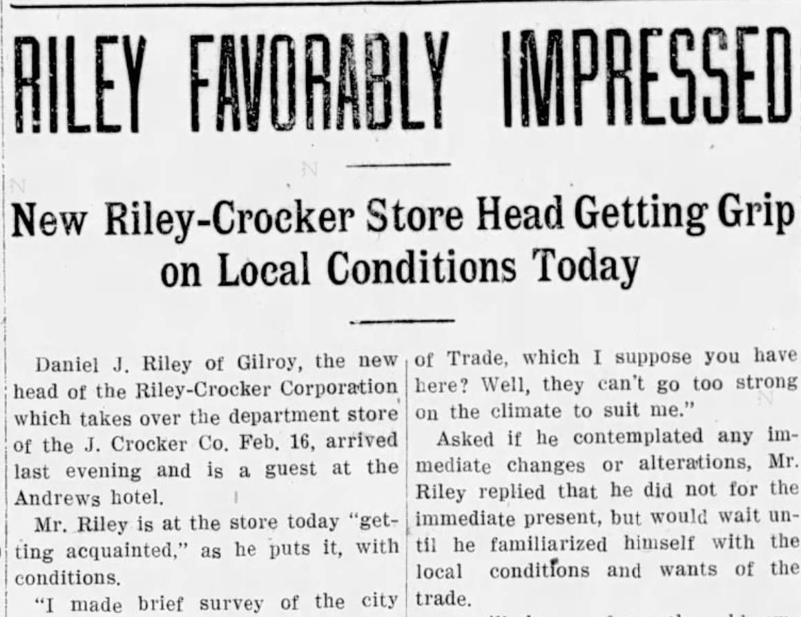And change, in this case, a new store name, can be good. Note that Mr. Riley is staying at the newish Andrew Hotel, at the site of today’s city-county library. Nearby, in the 1890s, a bawdy house called The Palace fulfilled the carnal needs of the gandy dancers working the Southern Pacific as the track neared town. The Andrews represented the beneficial side of Progress, such a nice place that evangelist Aimee Semple McPherson once spent the night there with her lover, also her radio engineer, as the couple fled Los Angeles for what the papers called “a love nest” in Carmel.