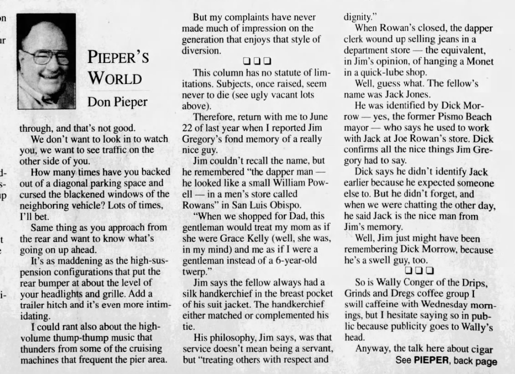 Mom died when I was seventeen, and I still miss her. But thinking about places like Riley’s brings her closer. San Luis Obispo when I was a little boy—the Sno-White Creamery and its milkshakes, the way pipe tobacco smelled in the smoke shop that was once the Cigar Factory, the way you raised the miniature Bear Flag at your table in Corcoran’s when you were ready to order lunch, the severe steel bun in Mrs. Avila’s hair (the lady underneath was not so severe) at the City-County library, today, the Repertory Theater–we are a bookish bunch, and visits to the library were always good for at least an hour and more often two— and, finally, the way my Mom was treated when she shopped for Dad at Rowan’s, a memory that was so powerful that the late (great) journalist Don Pieper was kind enough to quote me in his early 2000s column, which also cites another journalist, Wally Conger, my friend and colleague from the AGHS newspaper, The Altair: