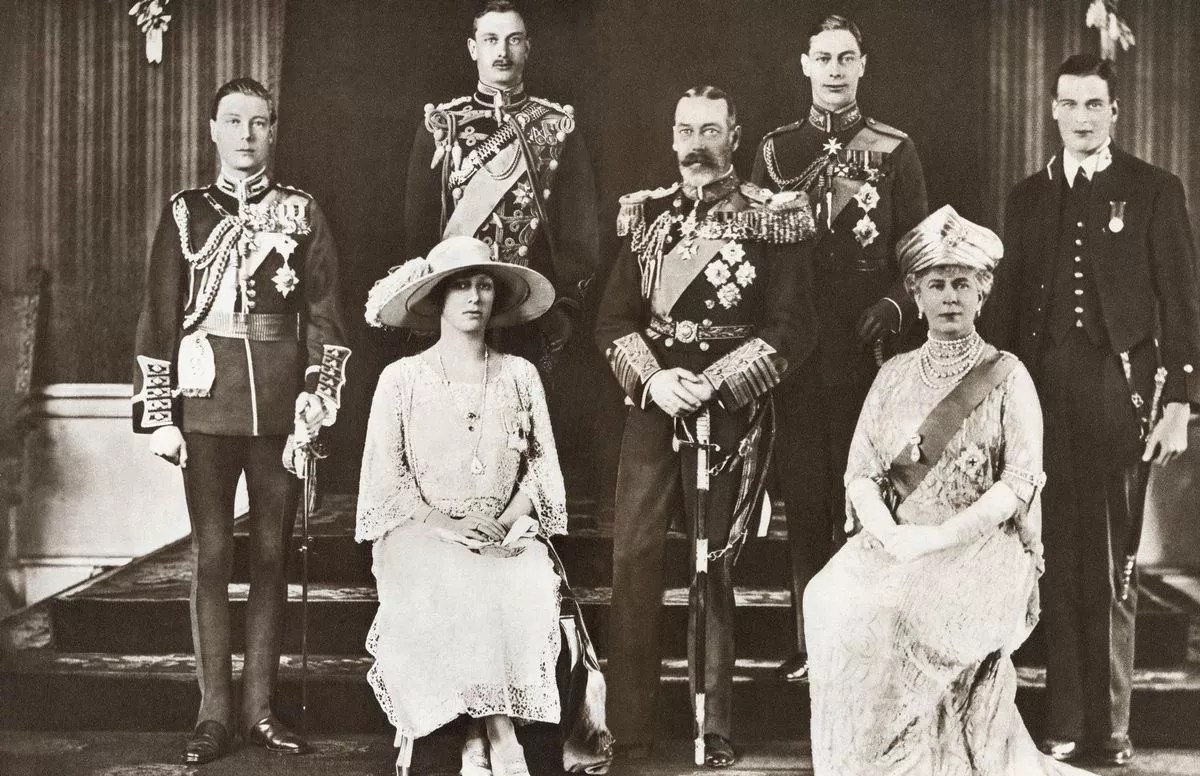 The principles, a jolly bunch. George V, center, who predicted that his son would muck it up, Queen Mary, lower right, David (Edward VIII) at left, Bertie (George VI) behind Papa.