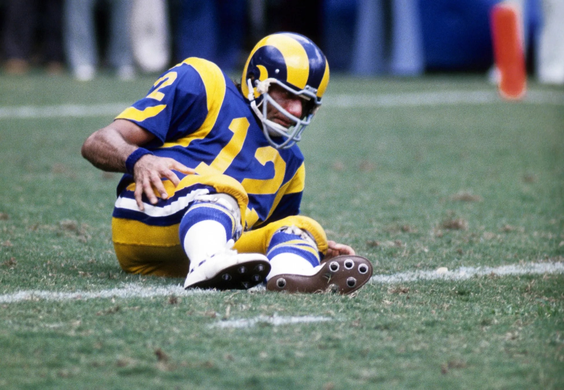 Today he’s a grandfather of six and kind of a parody because of those those Social Security spots (those people are sharks, by the way). But I can’t help but look, during those ads, at how his fingers are bent and arthritic and I remember, in his last years, as a Ram, that watching him enter and exit the field was a visual ordeal.