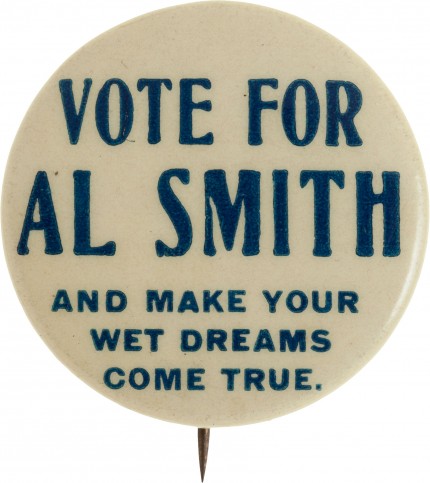Smith didn’t win the nomination that year, but he did in 1928 and ran against Hoover. Smith was Catholic, which produced a bigoted anti-Smith campaign button, and favored repeal of Prohibition, a plank on the 1928 platform that produced the most salacious campaign button in American history. The button didn’t work, of course, Hoover won what turned out to be, thanks to the October 1929 Crash, the booby prize.