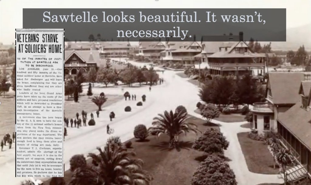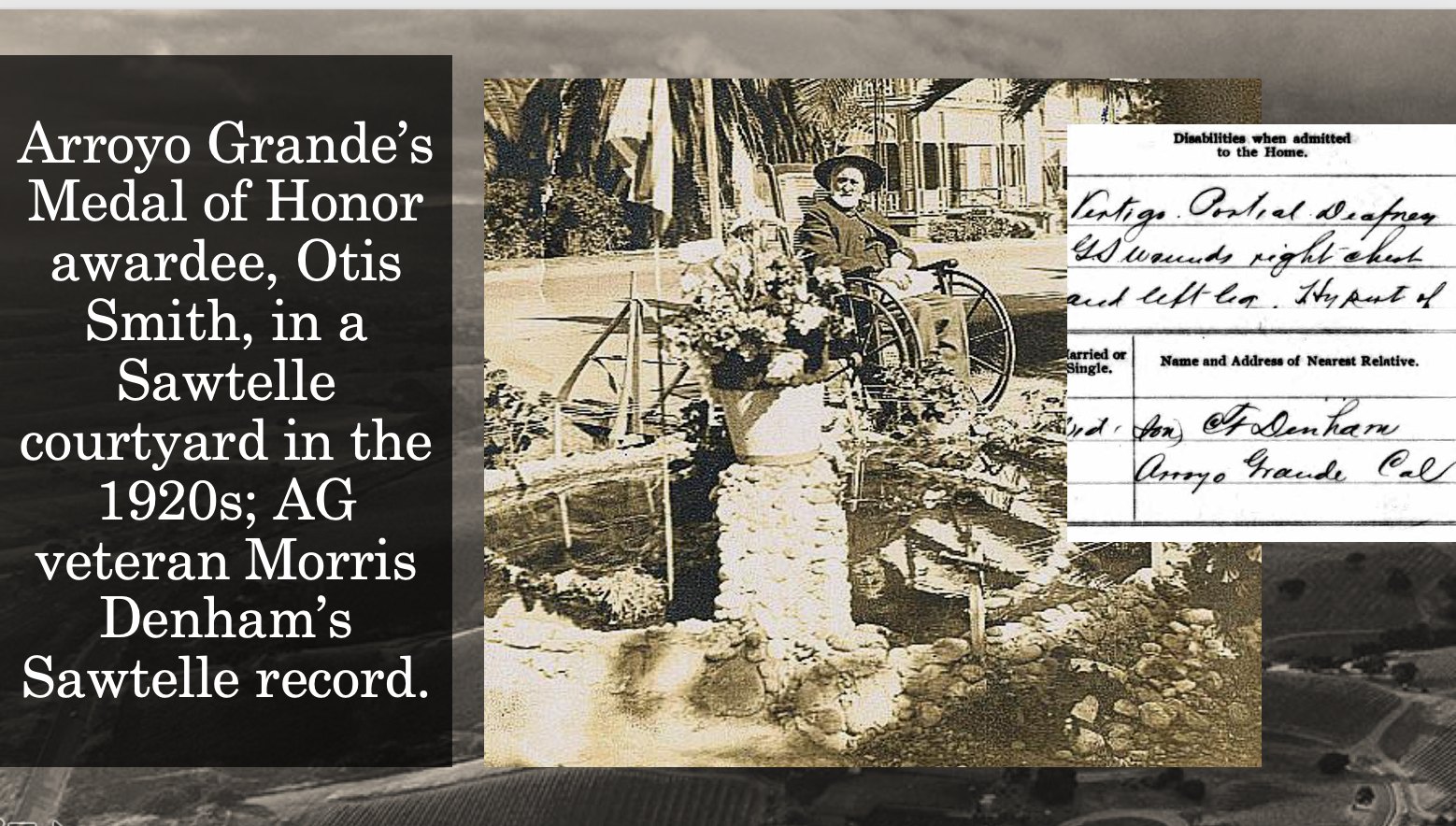 Yesterday I read a friend’s post that cited the West Los Angeles Veterans’ Hospital. I remembered that it was once called the Sawtelle (after the boulevard) Veterans’ Home. Two of Arroyo Grande’s Civil War veterans, Medal of Honor awardee Otis Smith and Morris Denham, whose home still stands on Ide Street, were patients there–as were many other South County veterans–but they were called “inmates,” which gives you an idea of how they were treated. “Prunes, toast and tea,” one of them sighed. “I know exactly what they’ll give us for dinner.”