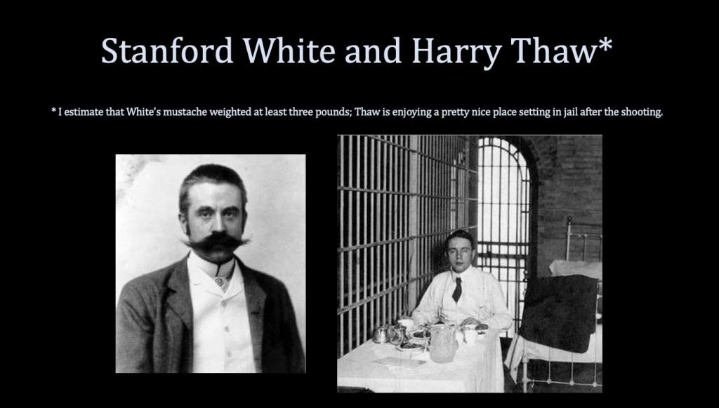 He did what we might call a “Bill Cosby” on up-and-coming model and showgirl Evelyn Nesbit. That is, he drugged and raped her. He was 48. She was sixteen. She would go on the become the archetypal “Gibson Girl.” White would go on to become richer and famouser. And deader.